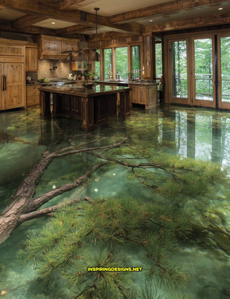 Epoxy tree flooring is a multi-layer resin system that permanently encases natural elements like branches, bark, pine needles, blossoms, and leaves beneath a crystal-clear topcoat. Designers create a composition on a sealed base layer, then build depth with several pours of transparent and tinted resin. The result is a durable, waterproof, 3D floor that looks like a suspended forest scene under your feet.
